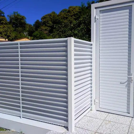 Завершённый проект ограждения: горизонтальный секционный забор типа жалюзи с применением ламелей Хай-Тек RAL 9003 в белом двустороннем покрытии полиэстер. Чистый и элегантный цвет подчёркивает современный архитектурный стиль, а горизонтальные линии создают эффект лёгкости и динамики. Такой забор не только обеспечивает приватность, но и гармонично вписывается в пространство, придавая территории ухоженный и статусный вид.